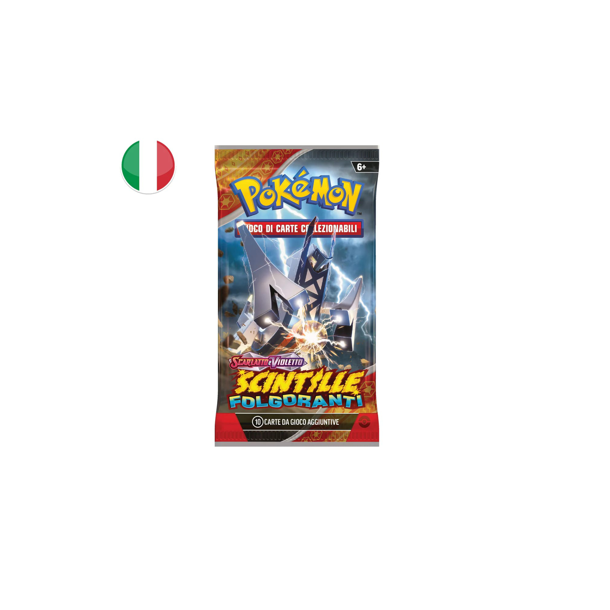 La bustina ufficiale Scarlatto e Violetto – Scintille Folgoranti contiene 10 carte Pokémon in lingua italiana appartenenti a una delle espansioni più attese della serie. Questa release introduce nuove carte Paradosso, Pokémon in forme alternative e illustrazioni speciali che arricchiscono sia il gioco competitivo sia il mondo del collezionismo.